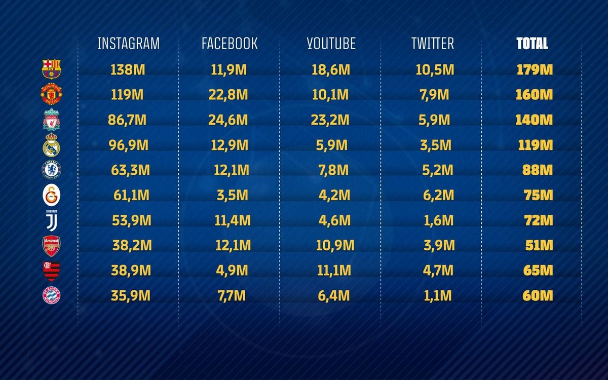 Between March 12 and May 14, Barça generated a total of 178 million interactions on its social channels on Instagram, Twitter, YouTube and Facebook, above the results of its main competitors: Manchester United (160 million), Liverpool (140m) and Real Madrid (119m). If we analyse this led by platforms, FC Barcelona is still number 1 on Instagram and Twitter, it occupies the second position on YouTube, where the element of analysis is video views, and the sixth on Facebook, according to Blinkfire data.
