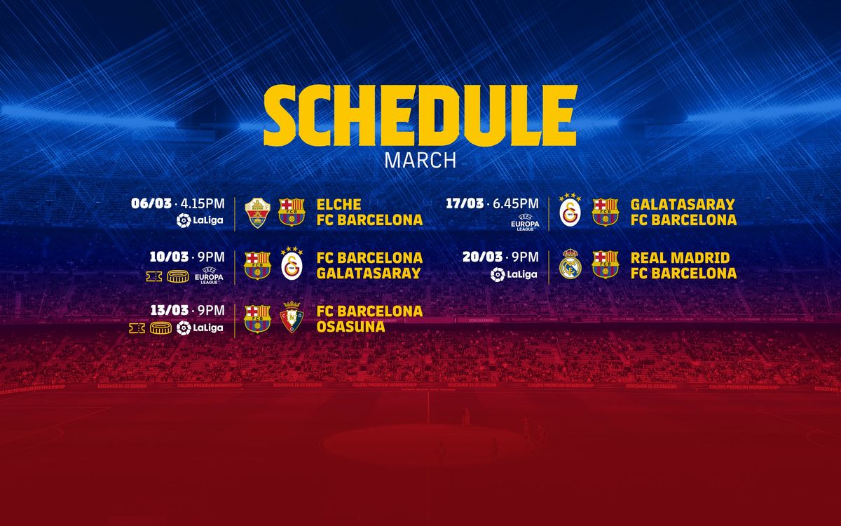 The final game of the month is none other than the Clásico in La Liga against Real Madrid at the Santiago Bernabéu. The game comes on Sunday 20 March at 9pm CET and hands Xavi Hernández's team the chance to turn around their recent run of disappointing results against their biggest rivals. Two frenetic weeks of activity for Barça which could go a long way to defining their 2021/22 season.
