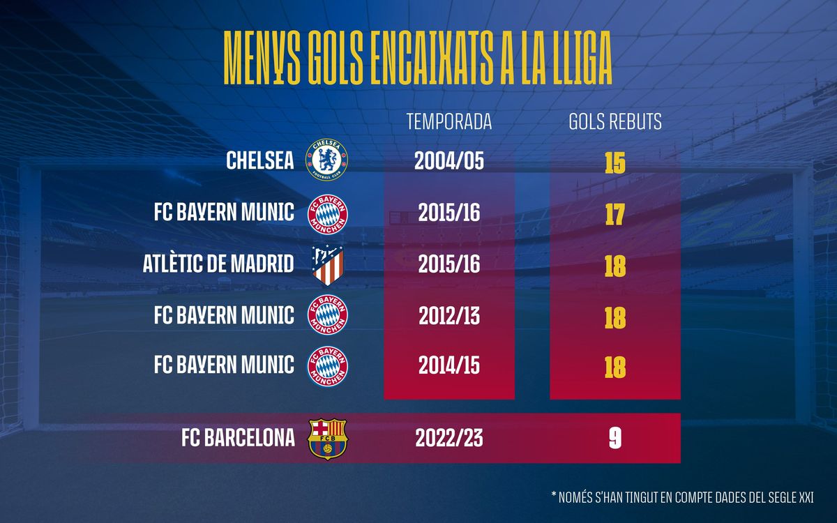 This could end up being the lowest number of goals conceded this century in Europe's top five league. That record also belongs to the Chelsea side coached by Jose Mourinho, which leaked just 15. If Barça can avoid conceding any more than six goals in their last nine games, they will have set a new record. They have a little more leeway to set a new Spanish Liga record, where the lowest tally is currently the 18 that went past Atlético Madrid in 2015/16.