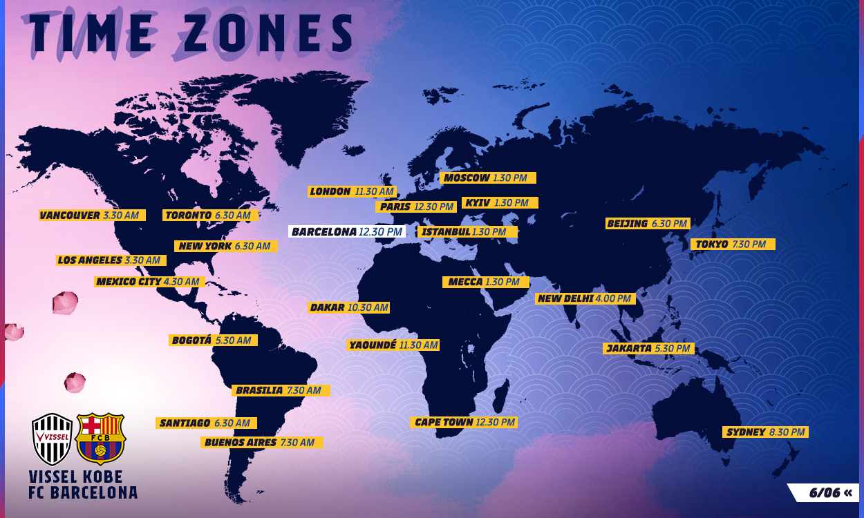 Tuesday June 6 will see FC Barcelona in Japan to play a friendly match against Vissel Kobe featuring Andrés Iniesta that will bring this season to a close. Kick-off is scheduled for 12.30pm local time in Barcelona and here are a list of the times at selected locations worldwide.