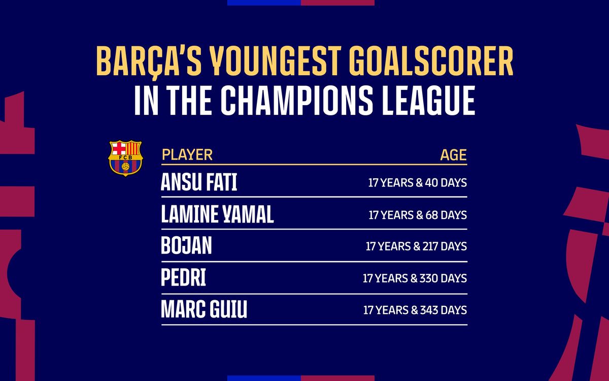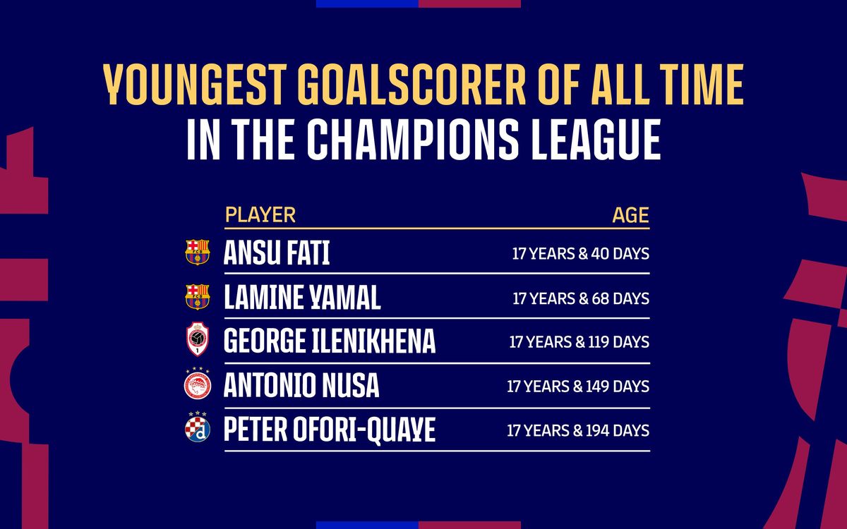 Lamine Yamal refuses to stop rewriting the record books! This Thursday he did it again with his goal against Monaco, which makes him the second youngest player ever to score in the Champions League. At 17 years and 68 days, he is just four weeks older than the record holder was when he scored his first goal in the competition. And that was none other than Ansu Fati, who was sitting the Barça subs bench in the very same game!
