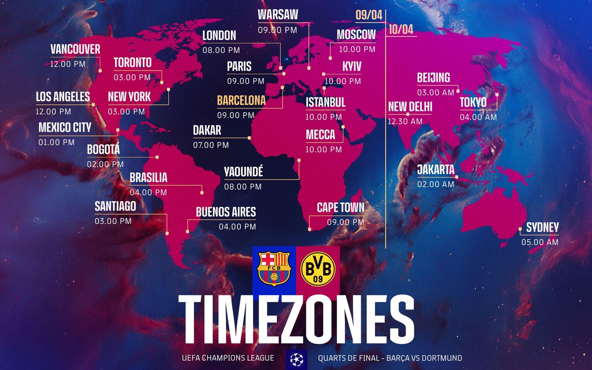 The season is reaching crunch time and on Wednesday Barça face Borussia Dortmund in the first leg of their Champions League quarter final tie. The first leg at the Estadi Olímpic Lluís Companys is a 9pm CEST start, and this page will help you work out what time that is where you are in the world.