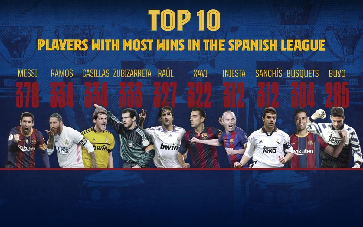 • Player with most wins in the Spanish league. As of May 27, 2021, he has 383 wins in the domestic competition