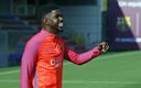 The French centre back is the centre of attention in an entertaining 'rondo' warm up between the first team players at the start of training